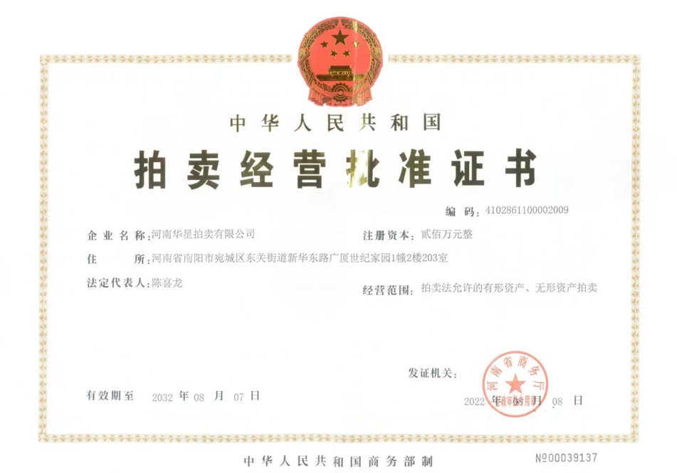 拍賣經營批準證書 |